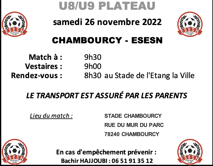 Rendez-vous au stade de l'Etang-la-Ville : 8h30 // Le transport est assuré par les parents